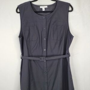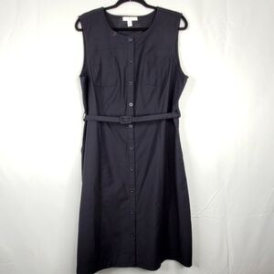 1901 Belted Twill Dress 16 Black Sleeveless Button Front with Pockets Preppy