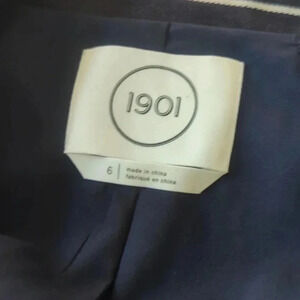 1901 Women's Striped Cotton Linen Blend Blazer Coat Two faux pockets in front. One internal pocket. Dark navy blue with white stripes.