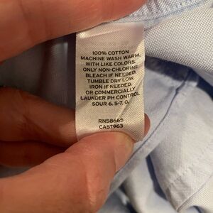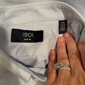 19901 Men's Trim Fit Button Down in pale blue. Neck size 15.5. Arm 32-33. Gently used with no flaws.