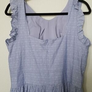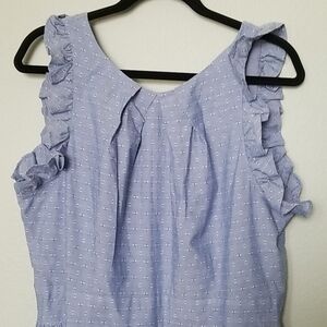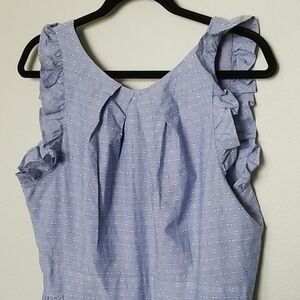 Chambray with a little dot type pattern all over. Ruffle sleeves. Has pockets! Hidden zipper closure in back.Back has a square look to it. There is a separation at the waist, looks like an easy fix for sewing. Wide leg. Lightweight cotton fabric. Cute pleats at the neck. Tagged as a 16 but measures like a 14. Girly, Twee, Brunch, event,gathering, date night, tomato girl, soft girl, dinner, vacation, day out, shower