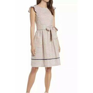 Business casual belted , ruffled sleeved striped dress in very great condition