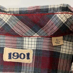 1901 SHIRT MENS L LARGE GRAY CRIMSON COTTON CHECK BUTTON UP LONG SLEEVE POCKET