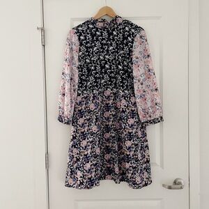 1901 Tie Neck Colorblock Mixed Floral Print Dress