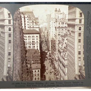 Historical 1902 Stereoview Card featuring Broadway New York City from a view on the Empire Building and showing Trinity Steeple. A unique collectible with a glimpse into the past.