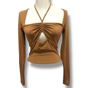 Trendy fitted top in a rich rust color with long sleeves, a front keyhole cutout, and halter-style tie straps.