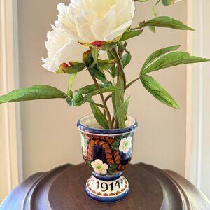 Wonderful hand-painted vase in blues and greens accented with white flowers. It is hard to find this vase, especially in such great condition. It was made 111 years ago. I have also listed another Aluminia Christmas vase from 1913 which could be bundled with this vase. The vase is 5 inches tall.