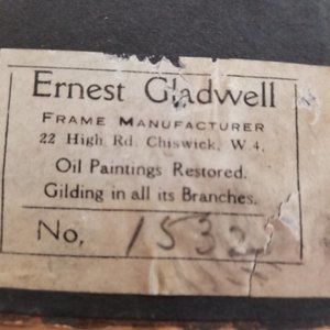 Marked on back of Frame Antique Frame is restored and marked. Gilded at carved edges by Earnest Gladwell of Gladwell & Patterson, London