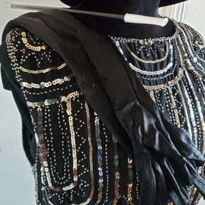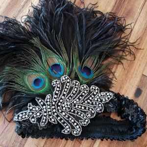 included: dress sequin size XL, dress shoes 8M, hat, long sleeve black gloves, cigarette holder, Peacock Feather Headpiece