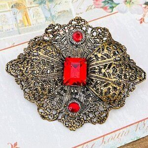 1920’s Antique Brass Filigree Bright Red Glass Stones Pin Antique