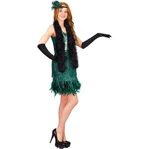 Features: This fabulous set includes a V-neck peacock green sequined dress with shimmering fringe, a black feather boa, a stylish flapper headband, sparkly crystal earrings, chic satin gloves, a faux pearl necklace, and a long cigarette holder. The dress is elegant with a touch of sparkle and flowing feathers that sway with every move, perfect for making a statement.