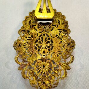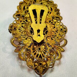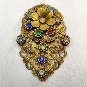 1920's Gold Tone Filigree Rhinestone Flower Fur Clip