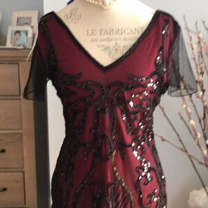 TAGS: #RedGatsbydress #VintageDress #FlapperDress #BurgubdyFlapperDress #Forgifts #ShortSleeveFringeDress #TrimDress #ProomDresss