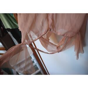 Wonderful vintage blouse that looks like it was made in the 1920's or even a little earlier maybe. It's a sheer soft peachy pink fabric that feels like chiffon, maybe silk, and it's beautifully decorated with embroidered flowers and cutout eyelet-type lines and dots. Mother of pearl buttons down the back and pretty flounced 3/4 sleeves with an attached flounce on each side at the bottom. There's something unusual at the waistline -- please see photos. It's like there's a slightly stretchy band that goes from the back around sides to the front, and the back also has a small buttoned-up section that has two empty button holes on each side at top -- maybe it had a matching skirt that buttoned into the blouse? I really just don't know even how it should be worn but I'm betting someone out there does. It's like there's an extra panel in there.