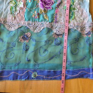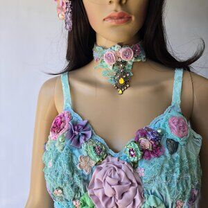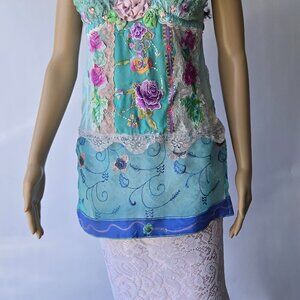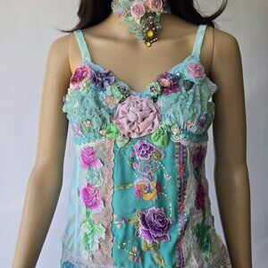 Inspired by the free-spirited glamour of the 1920s drop-waist silhouette, this one-of-a-kind top is a breathtaking swirl of pale aqua, soft pink, and lavender. Adorned with delicate blue and periwinkle flowers, the design uses an abundance of vintage trims, unique laces, and charming hand-worked rose blossoms to create a stunning, textural piece. Due to the use of unique, vintage materials, each top is one-of-a-kind and may feature small, delightful imperfections that tell a part of its unique story. Pair with a pencil skirt for a structured look or a feminine tulip skirt for a more romantic look.