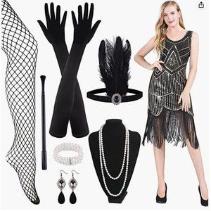 1920s V Neck Sequin Beaded Fringed Dress with 20s Accessories Set