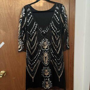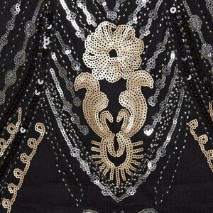 This 1920s Vintage Art Deco Flopper V-Neckline Silhouette Midi Dress in Black and Gold exudes elegance and sophistication. The dress features a V-neckline, 3/4 sleeves, and embellishments with beads and sequins, reflecting the Art Deco design of the era. Perfect for a party, cocktail event, or formal occasion, this dress embodies the glamour of the 1920s with a touch of Gatsby-style luxury. The large size ensures a comfortable fit for those looking to make a statement with a vintage-inspired ensemble.