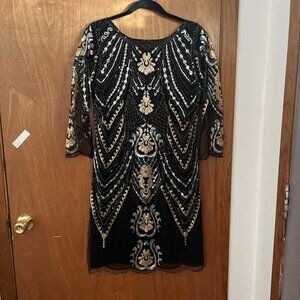 1920s Vintage Art Deco Flopper V-Neckline Silhouette Midi Dress Black/Gold Large