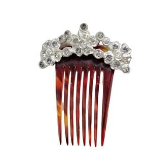 1920s Vintage Tortoise Shell Celluloid Metal Gemstone Flower Adorned Hair Comb