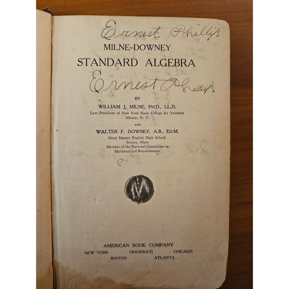 vintage algebra book, math textbook, 1911 algebra, educational book, antique book, Milne Downey, rare math book, algebra problems, historical textbook, collectible book, student annotations, hardcover math book, American Book Company