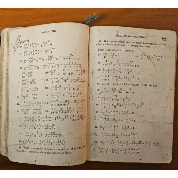 Vintage algebra textbook with mathematical problems and solutions. Includes handwritten notes and wear on the cover, adding character to this educational relic.