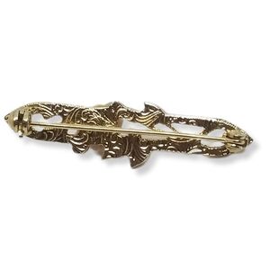 Very lovely pin from the brand 1928. Pin is goldtone with leaf designs, faux pearl and lovely little pink porcelain rose detail.  Pin measures 1-3/4 inches long and 1/2 inch wide. Excellent condition.