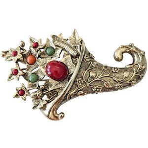 This 1928 Brand Cornucopia Pin Brooch is one of the most beautiful representations of the Thanksgiving holiday. It features a cornucopia, an ornamental container shaped like a goat's horn. The overflowing fruits, flowers, and other produce symbolize abundance. This beautiful cornucopia pin is overflowing with green, red, and green Lucite cabochons depicting maple fruits, acorns, and corns. The cornucopia is crafted from radiant gold-tone base metal, displaying an ornate design with a floral and vine pattern. This Cornucopia Brooch measures approximately 3.25 inches in width and 2.25 inches in length. The substantial size of this pin makes it perfect for displaying on almost any garment or accessory. This pin is unsigned, but it has a textured swirl design at the back, which is noticeable among the 1928 brand's unsigned pieces. The back has a locking pin that securely fastens to your clothing throughout the day.