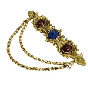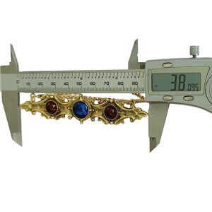 This lovely 1928 Brand Blue Glass Red Wine Lucite Cab Chatelaine Bar Brooch features a gold-tone bar setting with ornate details. The centerpiece is a blue glass and the other two are in red wine lucite cab. Attached on both ends are two dangling strands of chatelaine chains of varying lengths. This bar brooch measures approximately 3.8 inches in width and 0.8 inches in length. The back is unsigned, but it has a textured design same as 1928 brand costume jewelry that doesn't have markings. Also, it features a pin that is sturdy and secure, allowing the piece to be easily attached to clothing or accessories