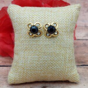 1928 Collection Gold Tone & Black Stud Earrings Small .5" Flower Crystal Accents
