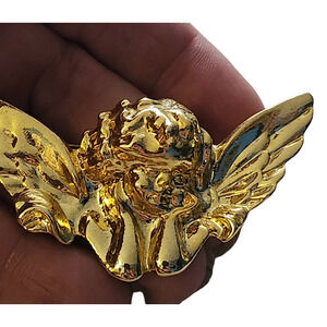 Add a touch of vintage charm to your look with this beautiful 1980s gold-tone cherub cupid pin brooch. This unique piece features a shiny gold tone that catches the light, highlighting the delicate details of the cherub design.