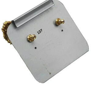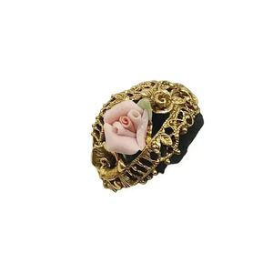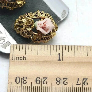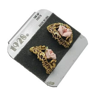 1928 Gold Filigree Hoop Earrings Pink Porcelain Flower Pierced Post
