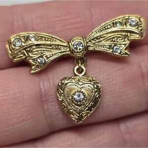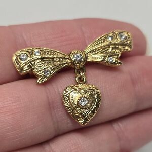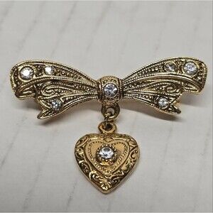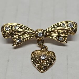 1928 Gold Tone Bow And Heart Dangle Brooch Pin.