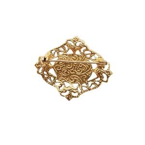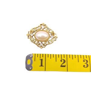 1928 Jewelry Co Brooch Gold Tone Open Work Filigree Faux Pearl Clear Rhinestone