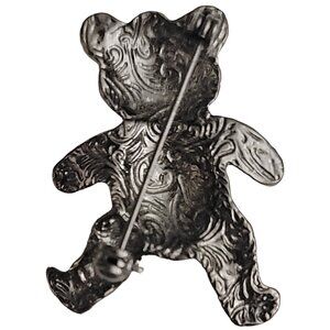 This teddy bear pin is made of clear rhinestones on a dark silver tone finish. It's made for long-lasting wear. The pin measures 1.4 inches in length. It has a textured swirl print pattern on the reverse, a 1928 maker's mark for the unsigned pieces. The back has a secure locking pin that functions properly. This brooch will add perfect bling to your outfit.