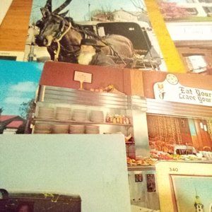 Vintage Lot of 10 Pennsylvania Theme Post Cards. Some are written and posted, some are blank. Baby Deer Hershey, PA- White border; Greetings from The Pennsylvania Dutch Country- horse and buggy; Amish Bishop- horse and buggy plastichrome; Miller's Smorgasbord Lancaster, PA; Stuckey's Pecan Shoppe Lancaster, PA; Thomas McKean Philadelphia, PA- Independence National Historic Park; Lamp Post Tea Room Gettysburg, PA; Broad St. North Philadelphia, PA- Ritz Carlton, Walton, and Bellevue Stratford Hotels- City Hall- post marked 1933 1 cent Green Franklin Stamp; Greetings from Philadelphia, PA- Linen post marked 1938 1 cent Franklin green stamp. All are in excellent vintage condition. Wear is consistent with age. No rips, tears, stains or repairs.