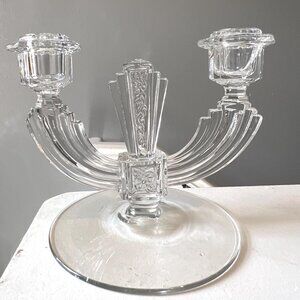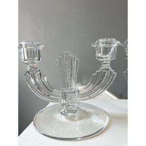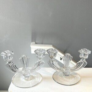 1930s Art Deco Glass Candle Holders Pair | Vintage Double-Arm Crystal Candelabra