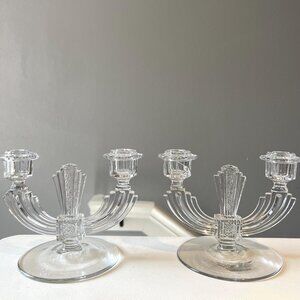 Elevate your table or mantle with this elegant pair of 1930s Art Deco pressed glass candelabra, featuring a timeless double-arm design with graceful ribbed curves and a fan-shaped etched center column.