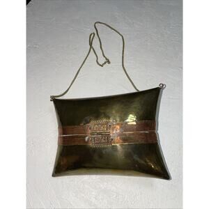 Stunning 1930s brass pillow purse with deep velvet trim and intricate embossed detailing. Unique clasp and curved silhouette. A rare Art Deco piece for collectors, vintage lovers, or evening styling.