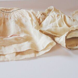 Vintage composition doll from approx the 1930's. She has brown open/close eyes, teeth and curly hair. Her clothes look vintage and worn with holes, tears and pins to keep closed. She has crazing, eye lashes are worn, some paint wear, discoloration on eyes. I am not sure if she is a Nancy doll. No markings on her body. Some discoloring on clothes, some metal shown through material on the back above legs.