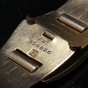 This is a beautiful vintage hinged brass bracelet from the 1930s featuring an engraved script monogram and a patented double hinge design. The patent number (1994-826) and letter “R” in a box are stamped on the inside. The bracelet opens easily by hinging to the side and stays open for simple on-and-off wear, closing securely when the sides are pressed together.