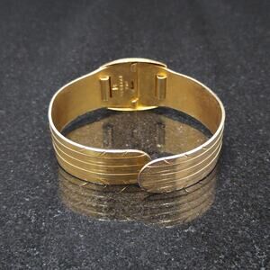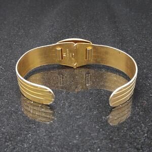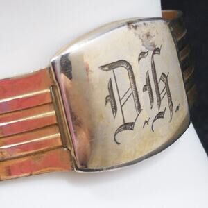 The front bears an ornate engraved initial “D” in an Old English style, followed by an unreadable letter or flourish. The bracelet is non-magnetic and believed to be solid brass with subtle gold tones and a soft aged patina. A lovely representation of early 20th-century craftsmanship, this piece would make a meaningful addition to any vintage jewelry collection or a unique gift for a history or design enthusiast.