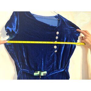 This elegant vintage gown, crafted by Openhym's Debuvel, exudes timeless sophistication. Made of luxurious velvet, it features sparkling rhinestone buttons and a striking Art Deco belt clasp. With its flattering silhouette and intricate details, this piece encapsulates the refined aesthetics of the 1930s, making it a stunning collector's item or wardrobe treasure.