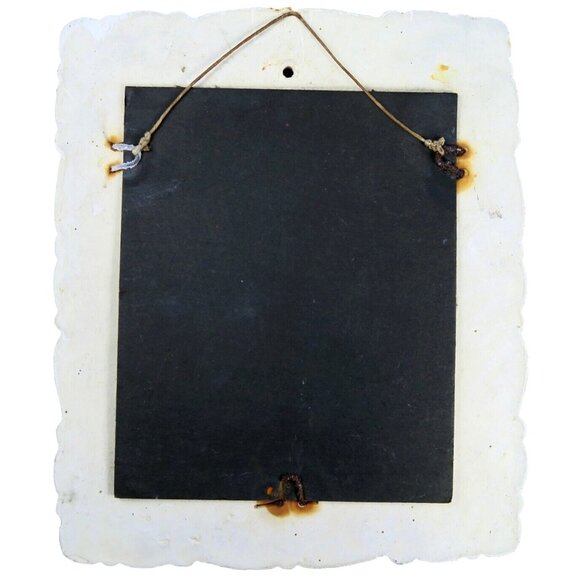 Unlike the more common metal-framed silhouettes, this piece is housed in a molded plaster frame with a hanging hole and original string mount. The frame measures approximately 7 × 6½ inches; the image window is about 3½ × 4½ inches. There is chipping to the plaster, especially at the top left corner, and rusting to the staples—both consistent with age and use.