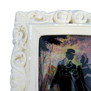 Reverse-painted silhouette art flourished as affordable home décor from the 1920s through the 1950s, often depicting romanticized Victorian scenes. This 1930s example features a strolling couple with their dog, hand-painted on the reverse of convex bubble glass. The background is a printed pastoral landscape, typical of the era’s layered technique.