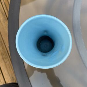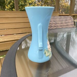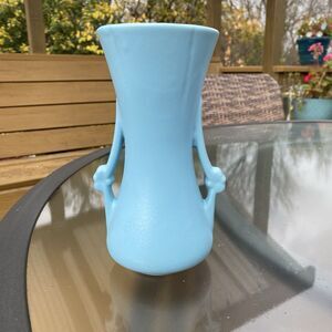 1930s WELLER BLOSSOM VASE ART POTTERY 7.25" X 3.5” AQUA BLUE FLORAL W/ HANDLES