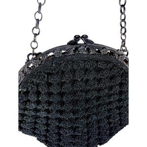 Lovely 1930s purse with carved celluloid frame and crocheted body with shell design. The frame has two love birds as the kiss clasp! The chain handle is metal but painted matte black. Lined with silk. There's an interior pocket. No rips or stains inside. The purse is in very good condition. No labels. The clasp does not snap shut but the purse does stay closed.