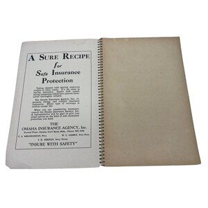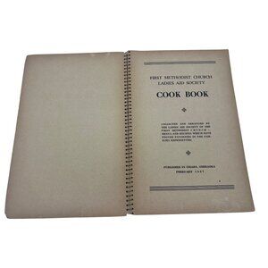 Vintage 1937 spiral-bound cookbook: First Methodist Church Ladies Aid Society Cook Book, published Omaha, Nebraska, February 1937. Measures approximately 8.75″ × 5.75″, with 96 numbered pages of church-community recipes and local business advertisements. Contains chapters such as breads/rolls, cakes, cookies, pies/pastry, meats, puddings, casseroles, salads, soups/vegetables. A collectible community cookbook with historical interest for Methodist/Church-aid society and Nebraska collectors.