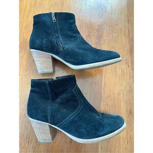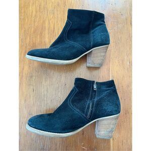 Black suede ankle boots, brand is 1937 footwear, size 8 1/2, good used condition, zips on inside to close, one small spot on right toe where a sticker was, lots of life still