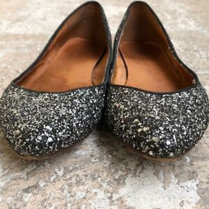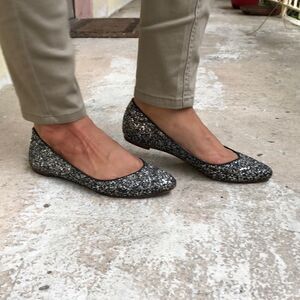 This glitter sandals are not new but are not missing any glitter but the souls have wear. The insole on one shoe under the toe needs to be reglued