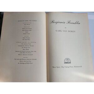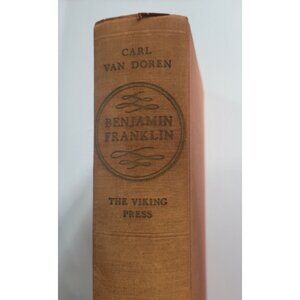 Vintage hardcover 1st Ed. Benjamin Franklin by Carl Van Doren. First Edition published in October 1938 by Viking Press, New York, NY. Printed in the USA by The Haddon Craftsmen. Distributed in Canada by The Macmillan Company of Canada, Ltd. A collection of autobiographical works.