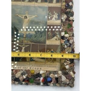 This product is a framed lithograph print depicting the Stations of the Cross, a religious tradition in Christianity. The print is handmade in the United States and features intricate details relevant to Catholic religious practices. This collectible piece would make a meaningful addition to any Christian's home decor, serving as a reminder of faith and spiritual reflection.